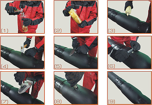 Для изоляции стыков используют компоненты пенополиуретана (А и Б) марки «ИЗОЛАН» с двумя типами вспенивающих агентов, наиболее распространенных, разрешенных к применению и обеспечивающих следующие требования: Компоненты ППУ дозированы в бутылки и входят в состав стандартных КЗС производства. Компоненты ППУ хранят в герметично закрытой таре в сухих помещениях при температуре от 10 до 25°С. Компоненты ППУ должны быть защищены от влаги и прямых солнечных лучей. Если указанные условия не соблюдаются, компоненты следует подготовить к применению согласно документации завода-изготовителя. Перед заливкой компонентов ППУ температура муфты не должна превышать + 30°С. Тщательно перемешанные компоненты заливают в муфту через заливочное отверстие. При температуре окружающей среды ниже +18°С перед заливкой компоненты и место стыка следует подогреть. При подходе пены к заливочному отверстию, молотком забивают дренажную пробку, обеспечивающую выход воздуха и лишней пены. Выход небольшого количества пены свидетельствует о полном заполнении объема стыка и правильном расчете нормы компонентов ППУ. После затвердения пены дренажную пробку удаляют, очищают поверхность муфты от излишков пены и устанавливают герметизирующую пробку для термомуфты и ПЭ- муфты, и металлическую крышку — для ОЦ — муфты. Для установки герметизирующей пробки в термомуфту или ПЭ- муфту используют прибор ЦТП. Во внутренний конус прибора вставляют пробку, прибор разогревают до температуры не более 200 С0 (полиэтилен не должен дымиться), а затем, нажимая на пробку, наружный конус прибора вдавливают в отверстие муфты. После углубления пробки во внутреннем конусе на 2 мм, прибор вынимают из отверстия, а пробку, с помощью пассатижей — из конуса. Оплавленную пробку вдавливают в отверстие муфты и удерживают под давлением в течение 20сек. Для выравнивания поверхности муфты, неровности пробки срезают ножом. Место установки крышки на заливочное отверстие ОЦ — муфты прогревают до температуры 80 — 90°С, прокладывают кусок клеевой ленты или герметика в размер с крышкой и закрепляют крышку по углам винтами — саморезами или заклепками. Порядок выполнения операций при теплоизоляции стыка (ТУ, ПЭ, ЭС-муфты) |