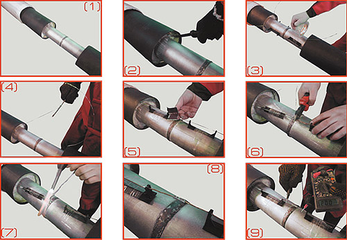 Если результаты измерений показали наличие дефекта (соединение проводников на предыдущем стыке выполнено с ошибкой), то его следует устранить и произвести повторные измерения. В случае поломки проводника на выходе из ППУ-изоляции его наращивают описанным выше способом, при этом с торца удаляют слой ППУ-изоляции достаточный для выполнения этой операции.